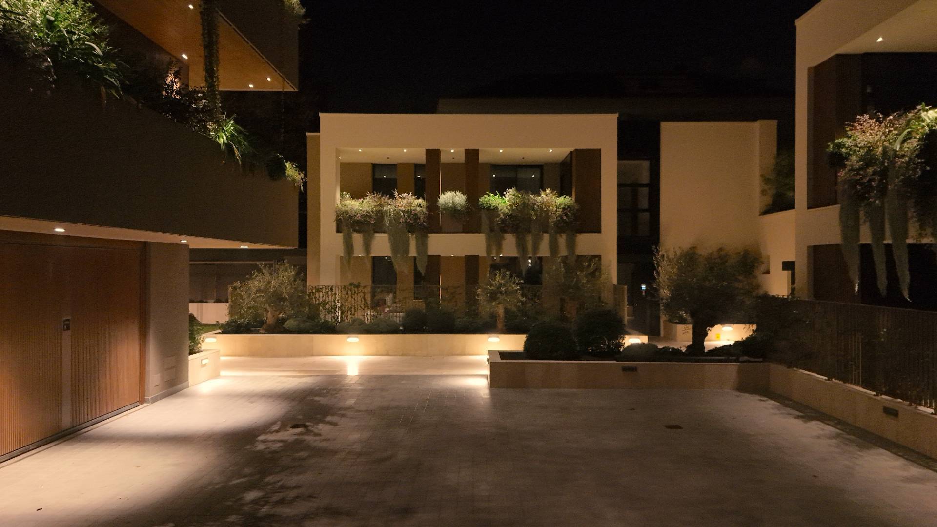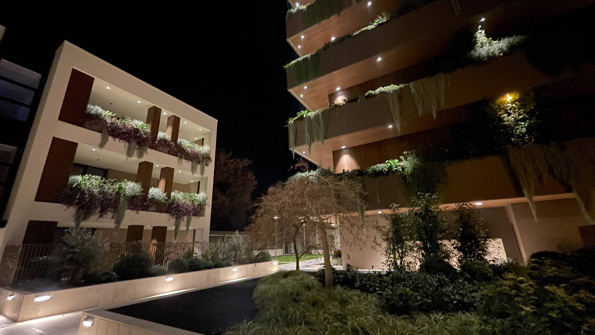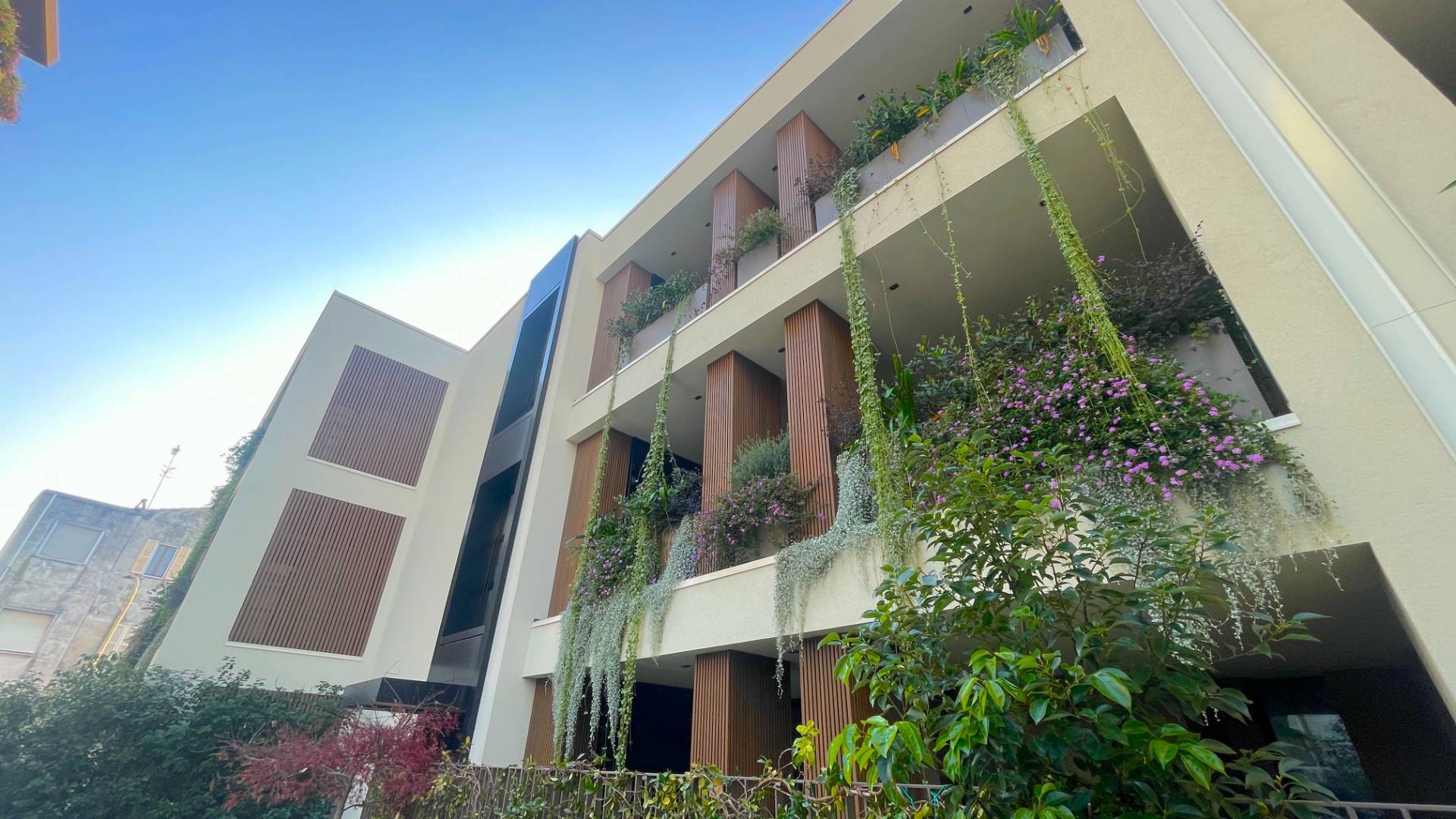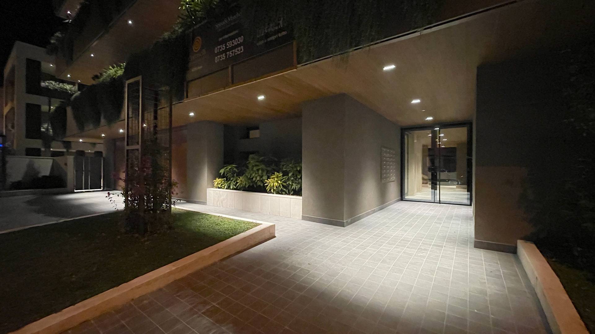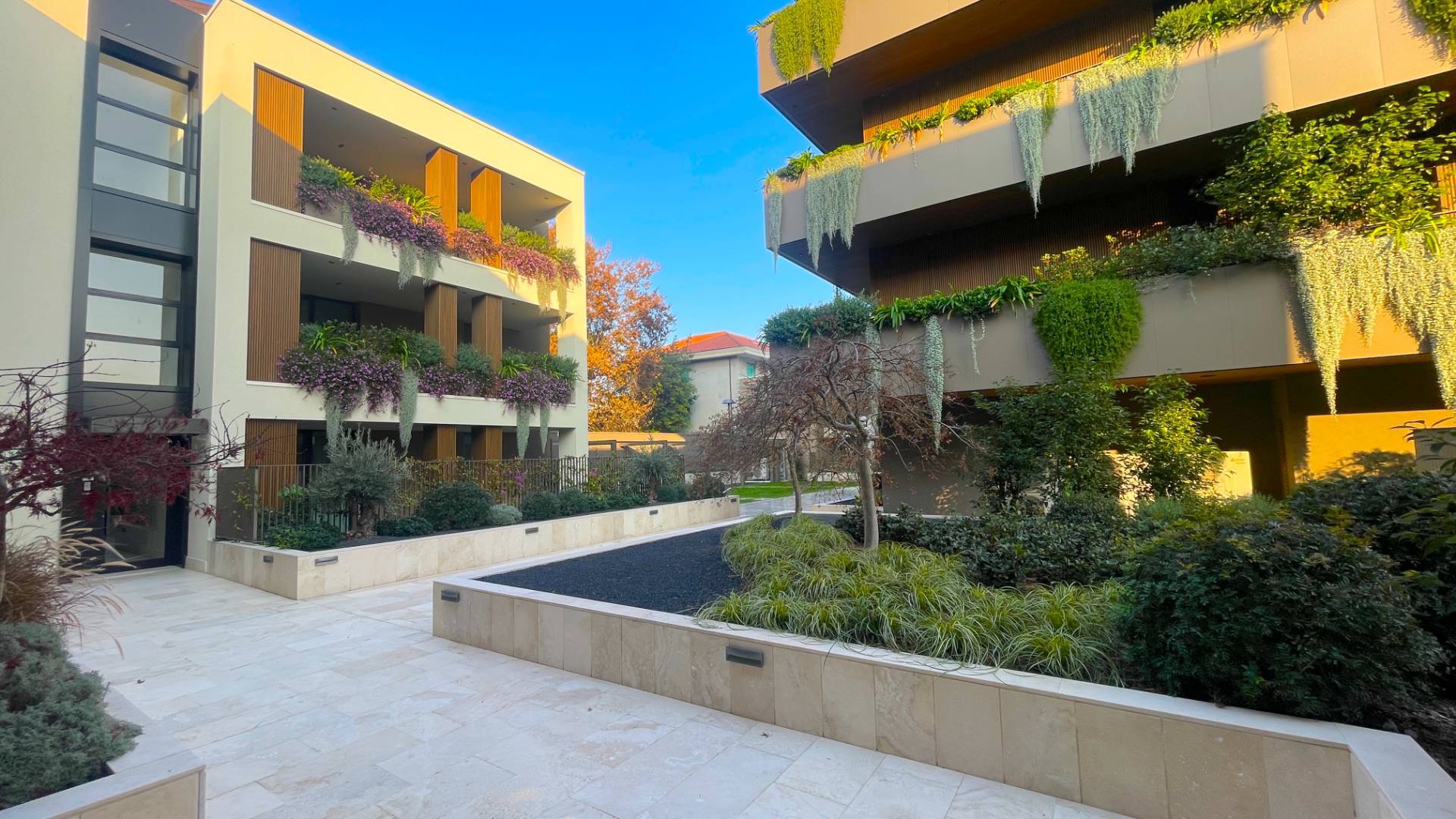 L'Appartamento si trova in una piccola palazzina di tre piani, parte del prestigioso complesso residenziale Caroselli Garden House. Questo complesso esclusivo è accessibile solo ai residenti tramite tastierino numerico all'ingresso ed è immerso in un magnifico giardino interno, arricchito da piante ornamentali disposte su balconate e logge. L'irrigazione del verde è gestita da un sistema centralizzato con accumulo d'acqua.