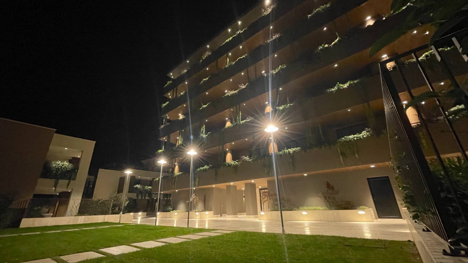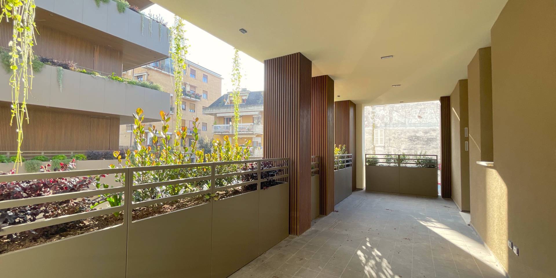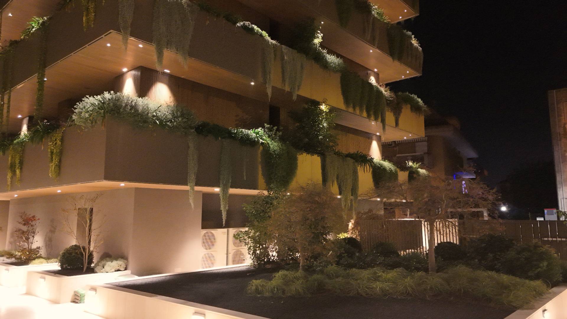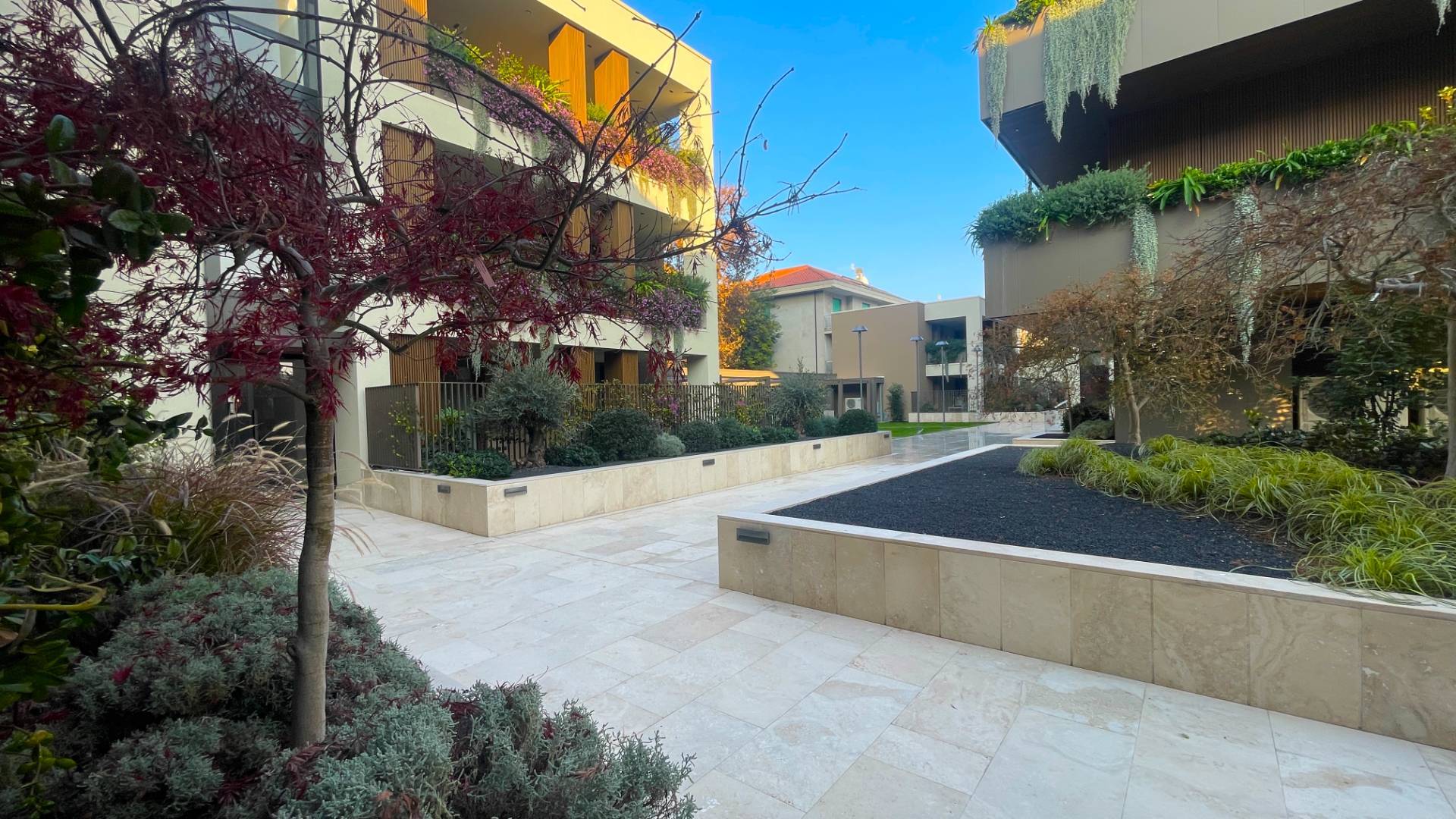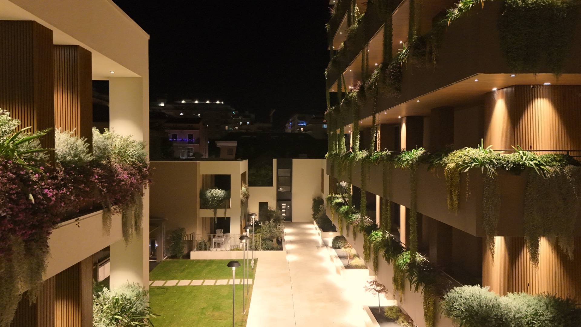 L'Appartamento si trova in una piccola palazzina di tre piani, parte del prestigioso complesso residenziale Caroselli Garden House. Questo complesso esclusivo è accessibile solo ai residenti tramite tastierino numerico all'ingresso ed è immerso in un magnifico giardino interno, arricchito da piante ornamentali disposte su balconate e logge. L'irrigazione del verde è gestita da un sistema centralizzato con accumulo d'acqua.