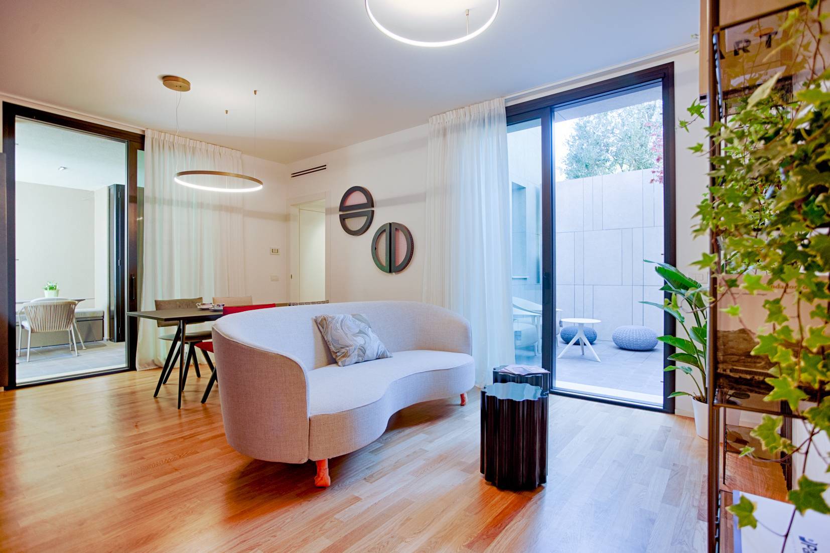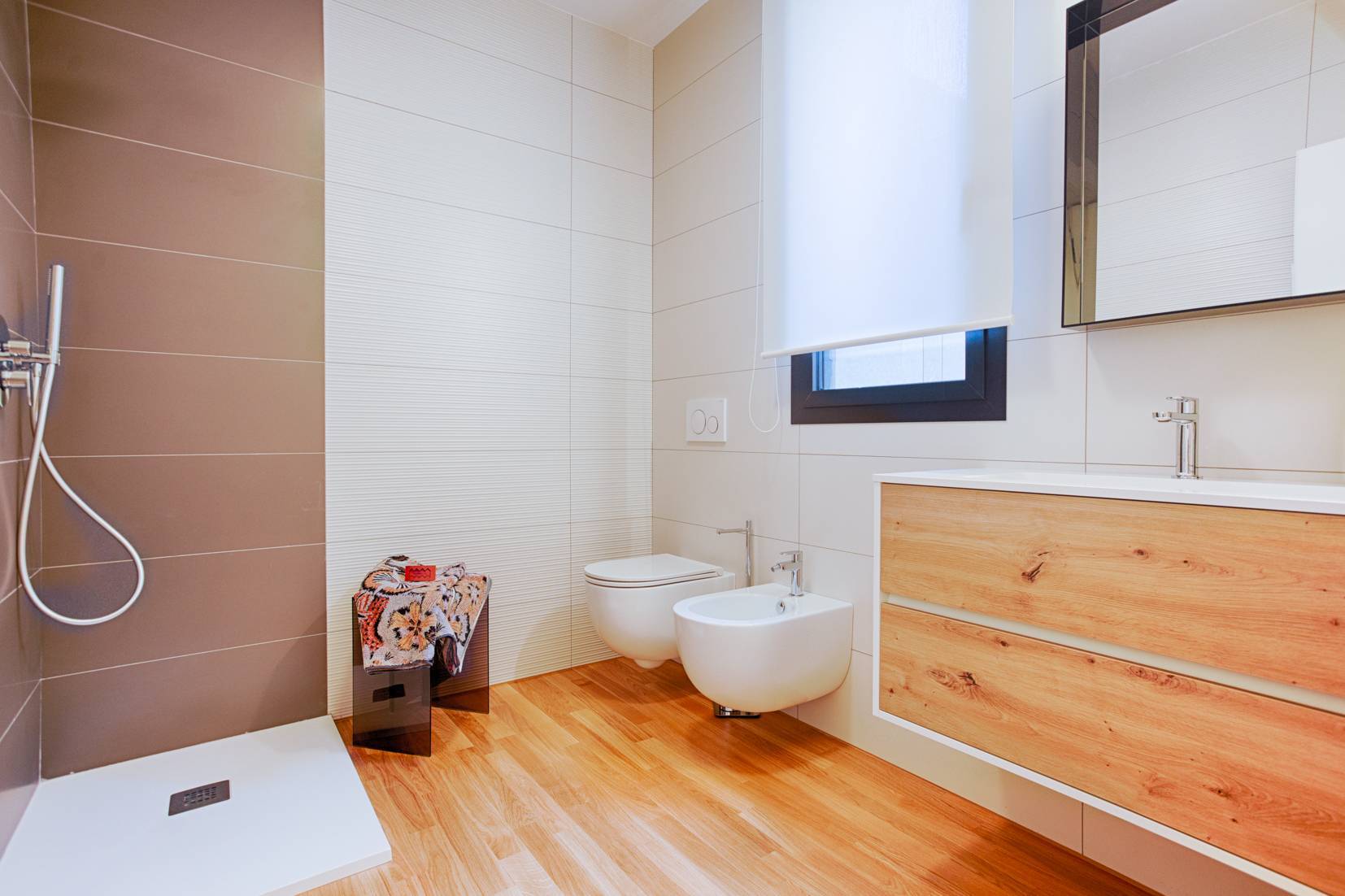 L'immobile è pronto per la consegna e presenta finiture di pregio, tra cui pavimenti in parquet di rovere su tutta la superficie, infissi certificati Schüco e un impianto di riscaldamento e raffrescamento canalizzato, gestibile tramite app con controllo della temperatura per ogni ambiente.