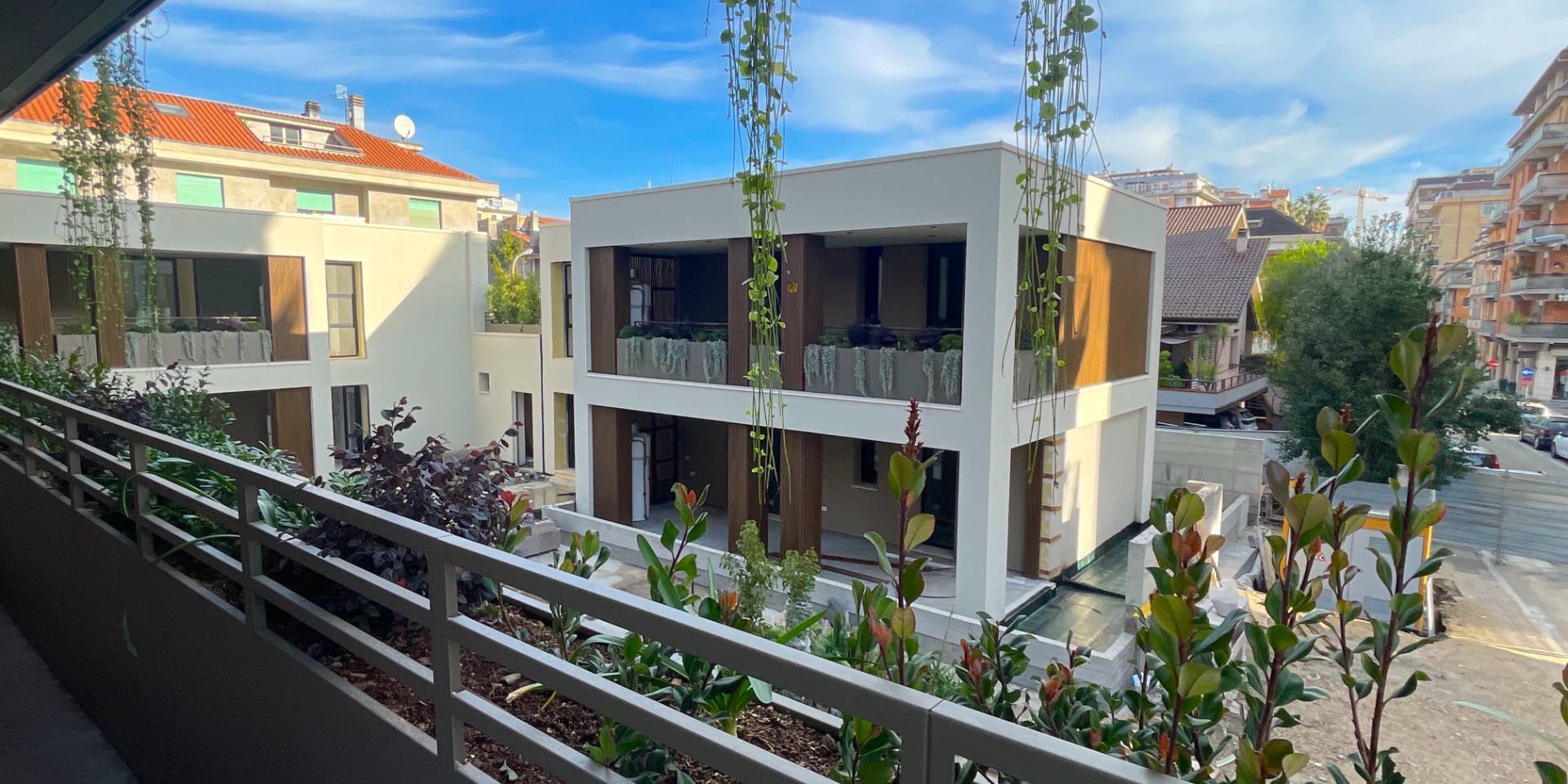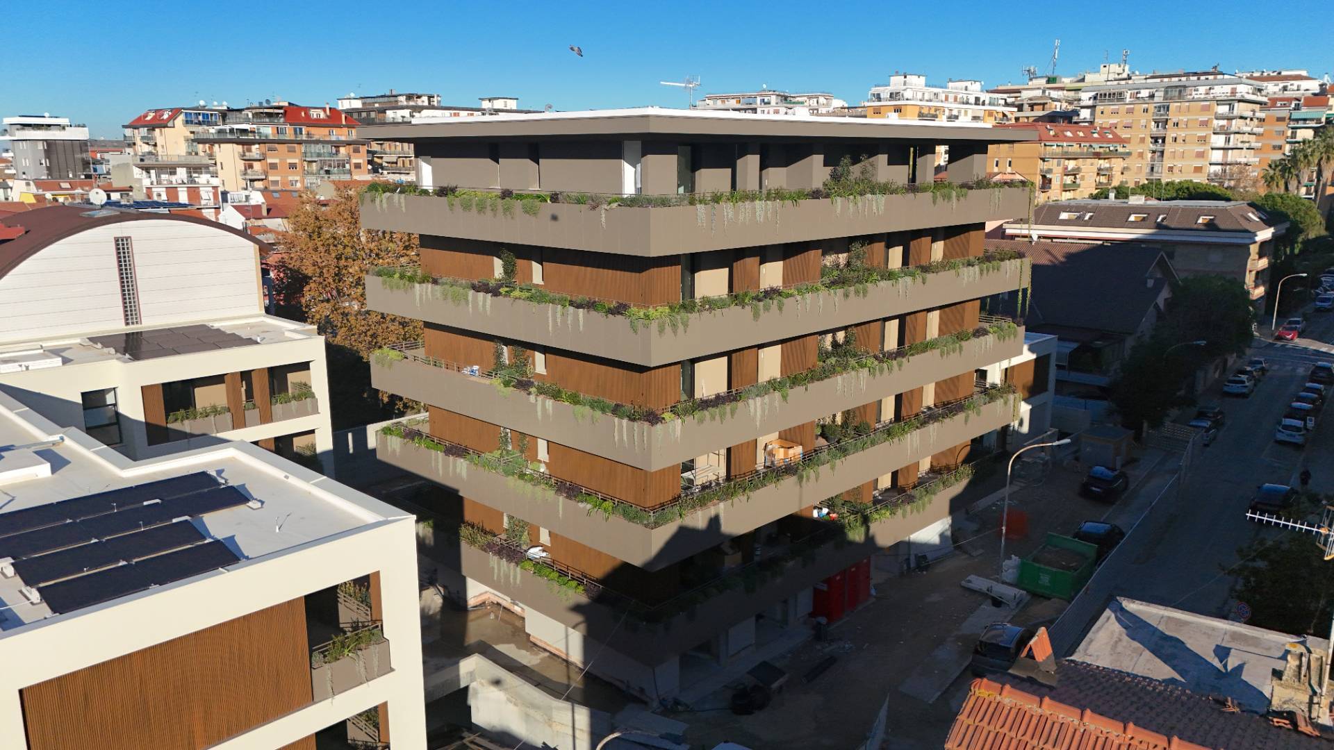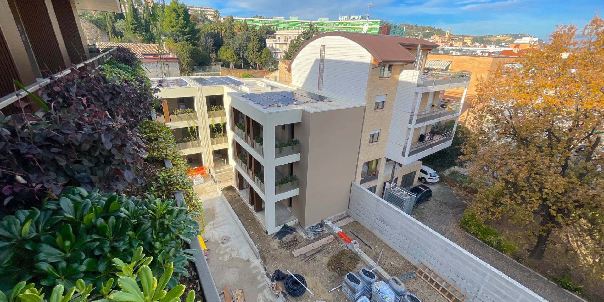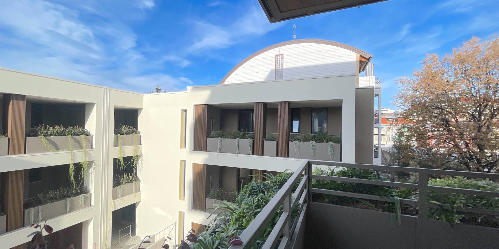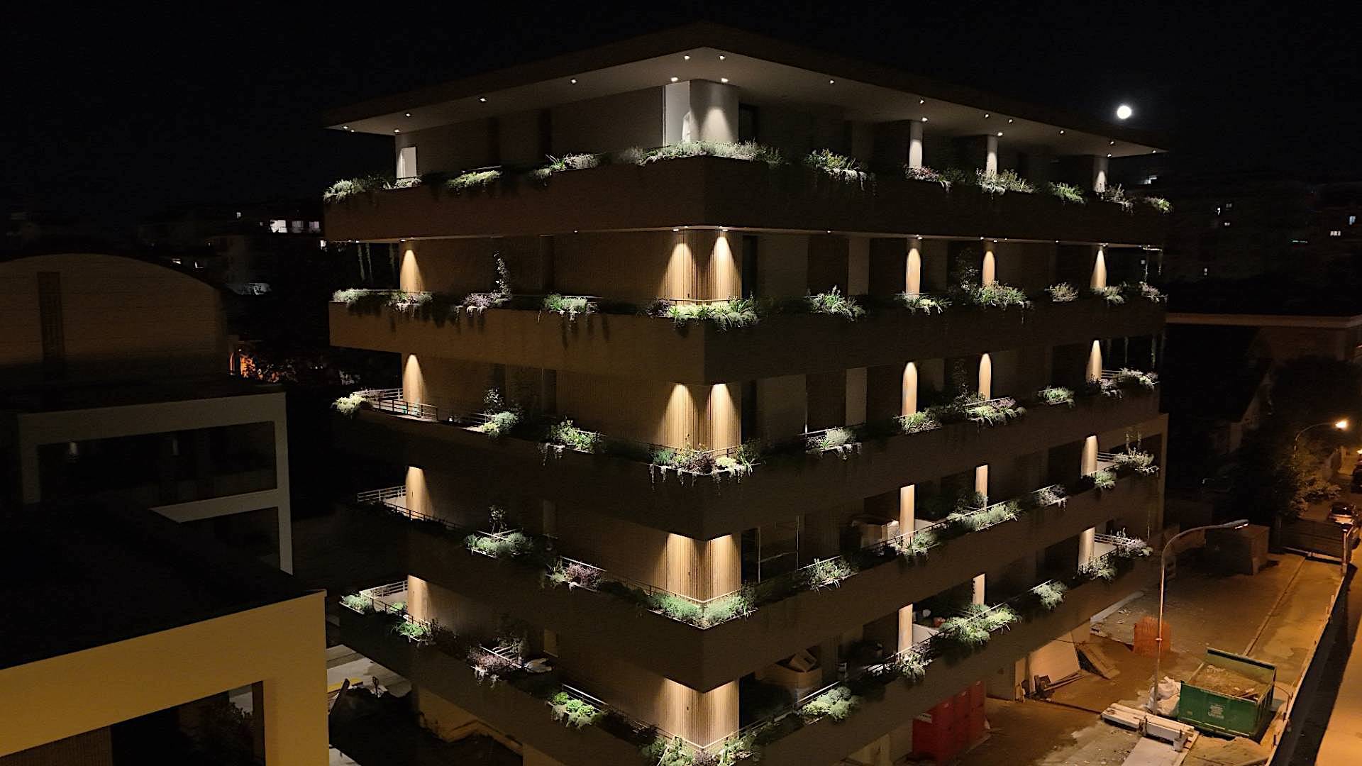 Il complesso residenziale è circondato da un meraviglioso giardino interno e piante su tutte le balconate e logge esterne, con un sistema centrale di irrigazione che utilizza acqua recuperata in accumulo. Inoltre, l'edificio è stato realizzato in classe energetica NZEB (Near Zero Energy Building), con un impianto fotovoltaico centrale da 44 kW e soluzioni progettuali ecocompatibili come il cappotto esterno e l'ottimizzazione dell'irraggiamento naturale.