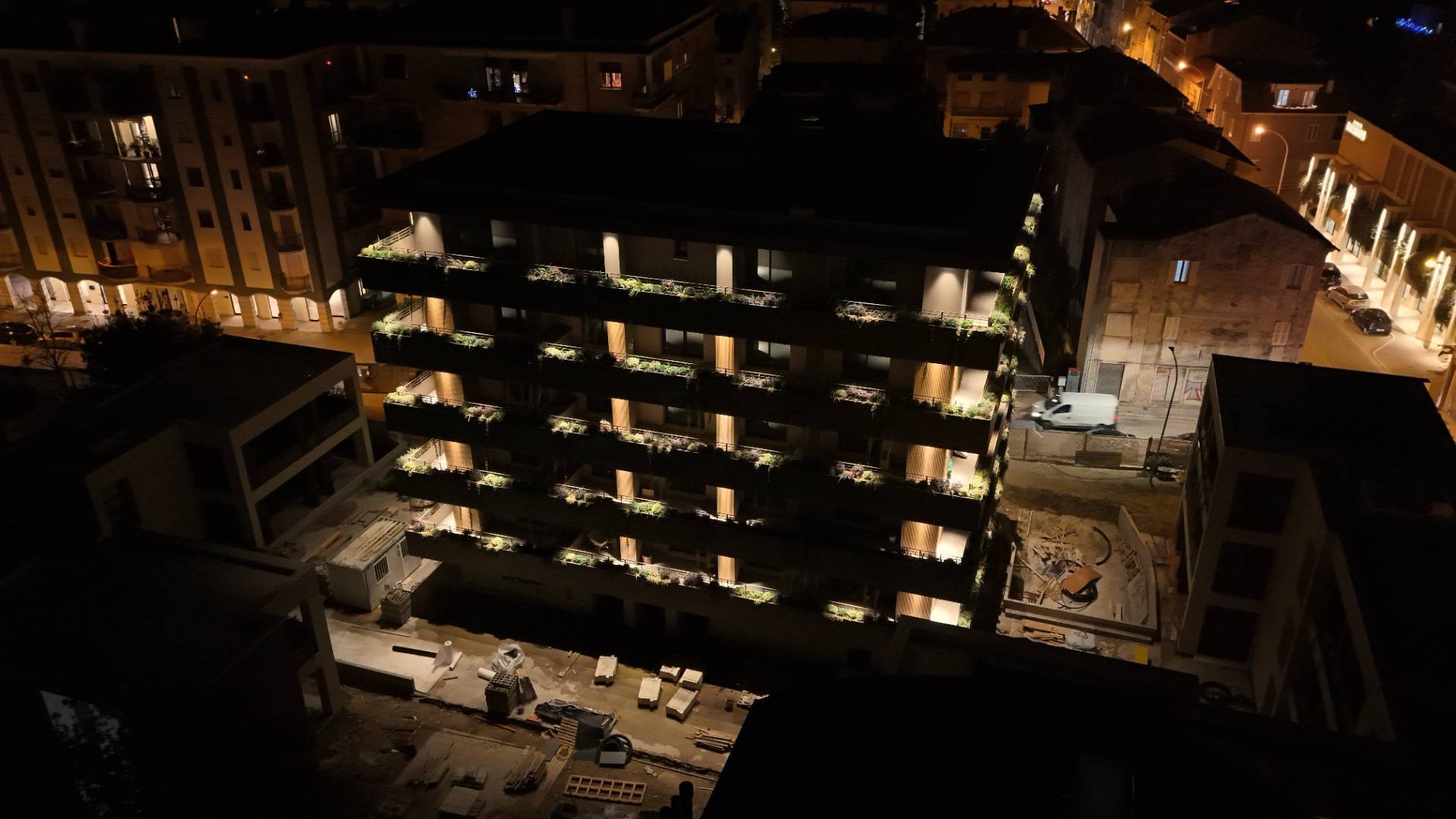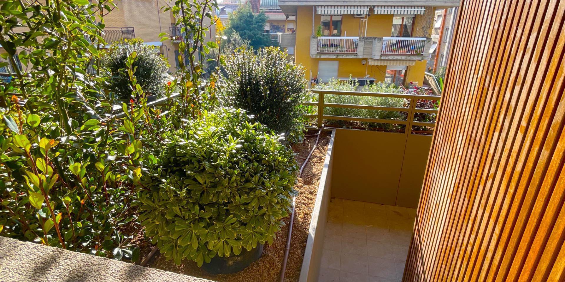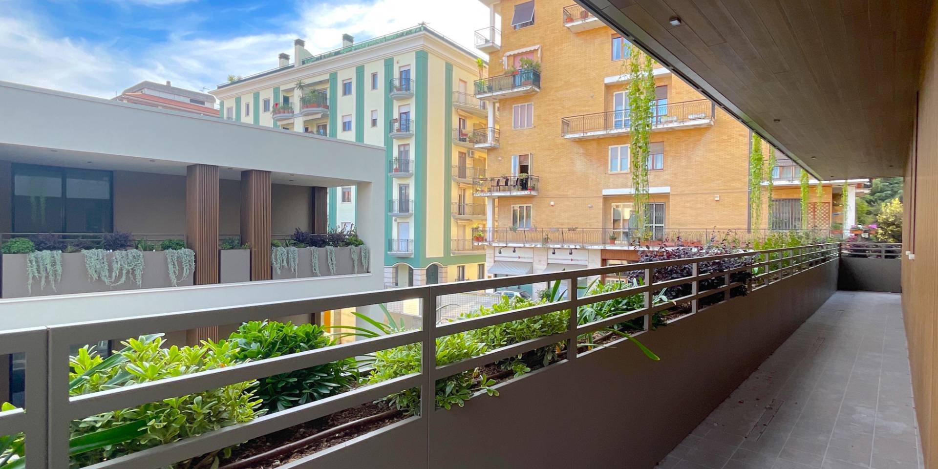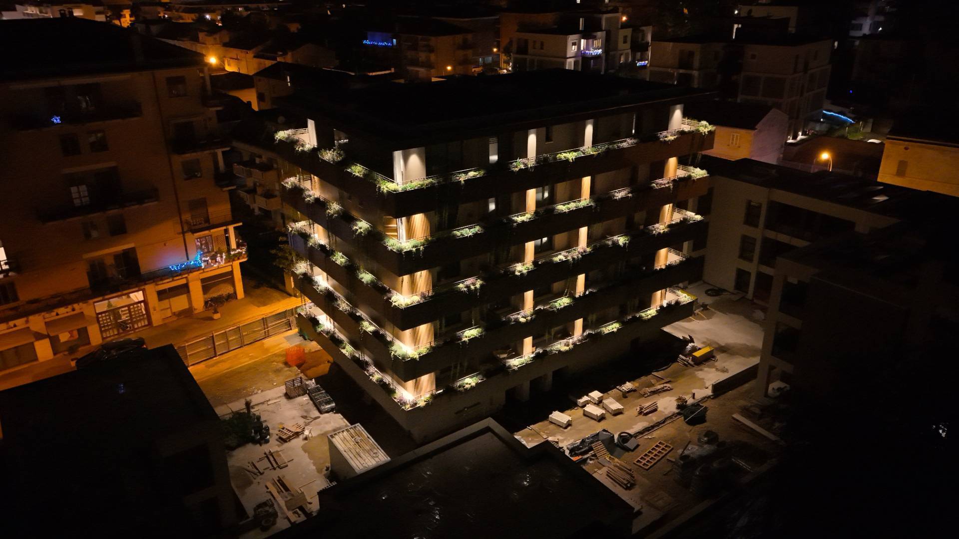 Il complesso residenziale è circondato da un meraviglioso giardino interno e piante su tutte le balconate e logge esterne, con un sistema centrale di irrigazione che utilizza acqua recuperata in accumulo. Inoltre, l'edificio è stato realizzato in classe energetica NZEB (Near Zero Energy Building), con un impianto fotovoltaico centrale da 44 kW e soluzioni progettuali ecocompatibili come il cappotto esterno e l'ottimizzazione dell'irraggiamento naturale.