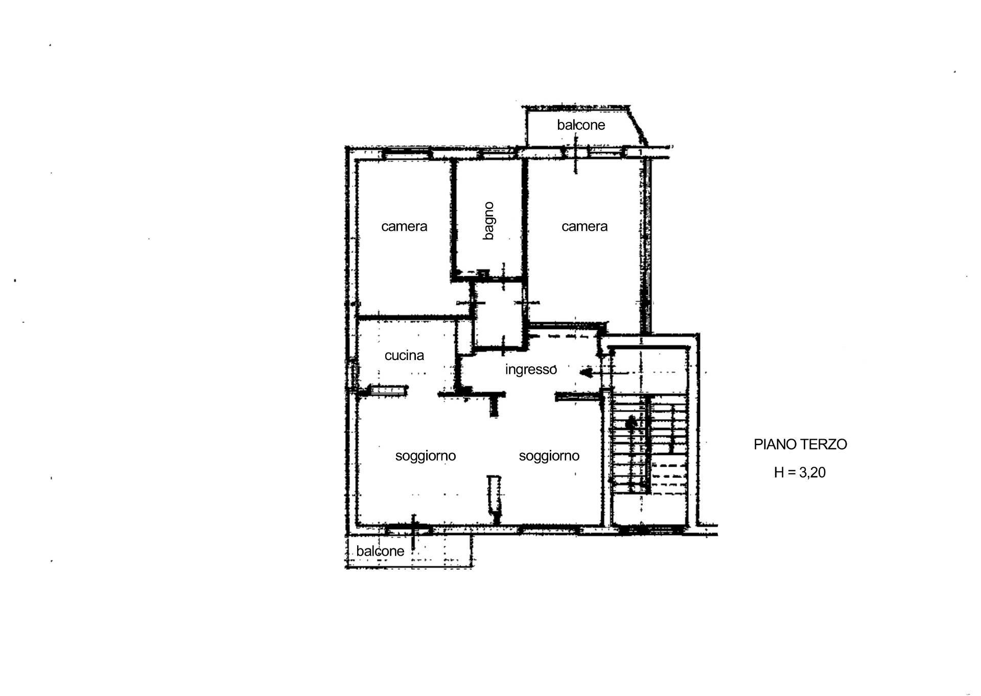 Appartamento al terzo piano senza ascensore, delle dimensioni di 105 mq circa composto da: ampio soggiorno, cucina abitabile, disimpegno, 2 camere camere da letto matrimoniali, 1 bagno e 2 balconi.