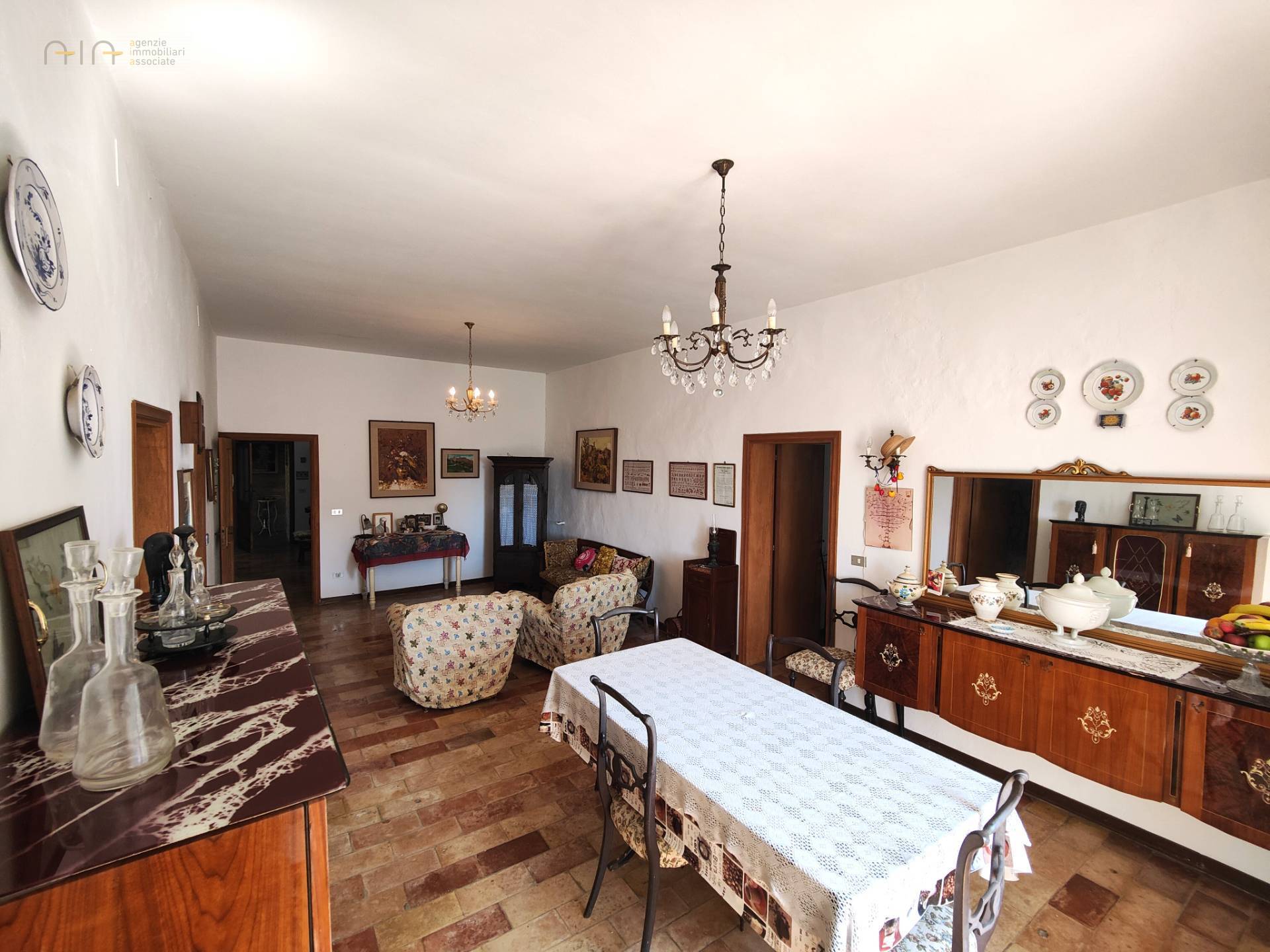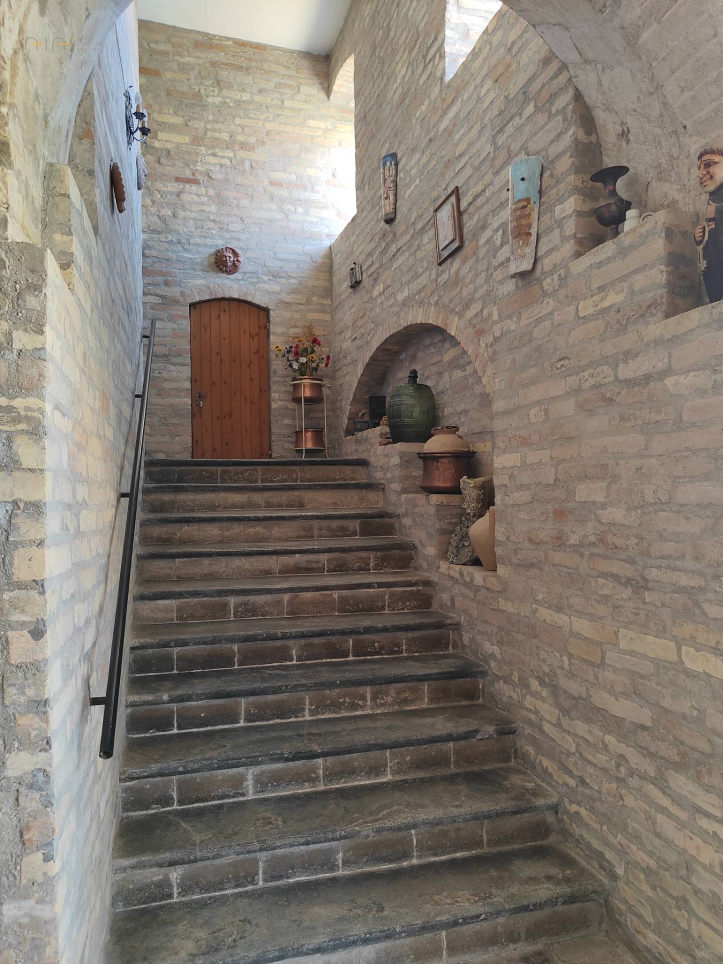- al piano primo l'abitazione di mq 185 circa, collegato al piano inferiore da una bellissima ampia scala rifinita con antichi mattoni a faccia vista ampio ingresso, cucina abitabile con camino, grandissimo soggiorno, d'antica impostazione, dal quale distribuiscono le tre stanze da letto, due bagni, ampio ripostiglio-lavanderia con scala di collegamento con il sovrastante piano soffitta sottotetto (allo stato grezzo). La pavimentazione dell'ingresso-corridoio e dell'ampio soggiorno sono in cotto originale.