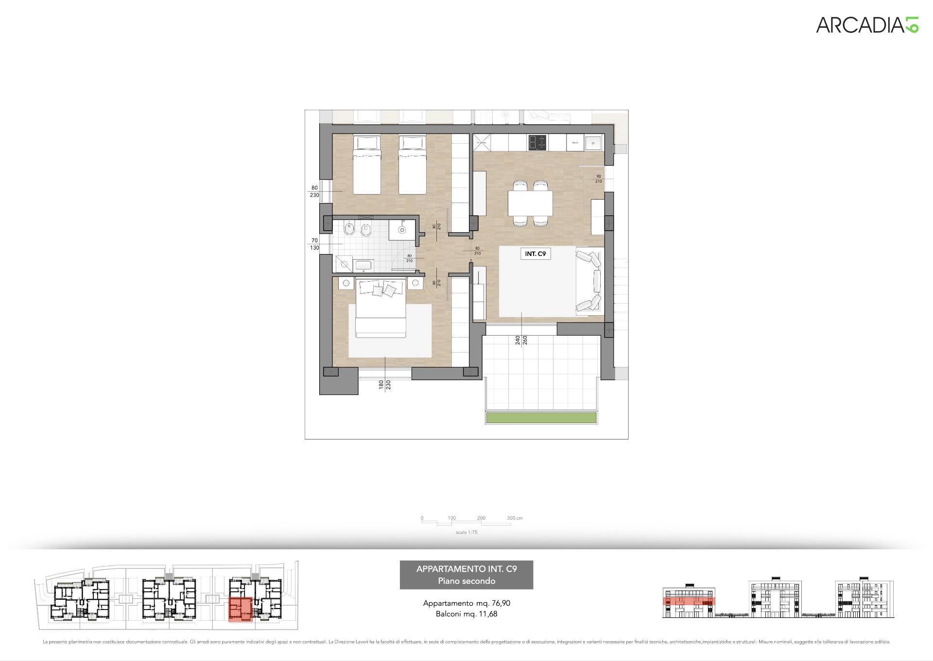 Appartamento al piano secondo con ascensore, delle dimensioni di 77 m² circa, composto da ingresso su soggiorno con angolo cottura, due camere da letto (una matrimoniale ed una doppia), un bagno finestrato, disimpegno nel reparto notte. L'Appartamento è inoltre fornito di una terrazza abitabile di ben 12 mq circa, fruibile nella bella stagione per poterci soggiornare.