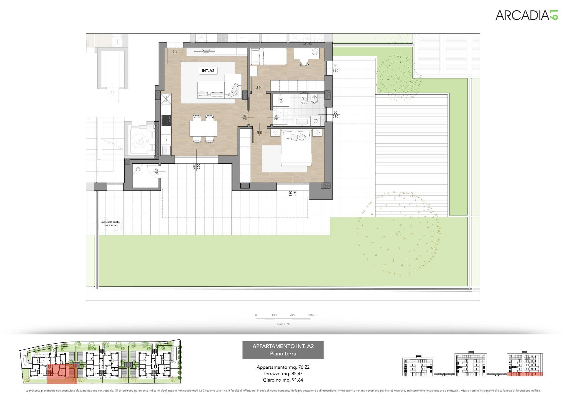 Appartamento al piano terreno, delle dimensioni di 76 m² circa, composto da ingresso su soggiorno con angolo cottura, due camere da letto (una matrimoniale ed una spaziosa singola), un bagno finestrato, corridoio nel reparto notte e comodo ripostiglio lavanderia esterno sulla corte. L'Appartamento è inoltre fornito di una corte esterna pavimentata delle dimensioni di 85 mq circa, oltre ad un giardino privato di 72 m² circa allestito a verde e recintato. Completa la proprietà una fioriera privata di 20 mq.