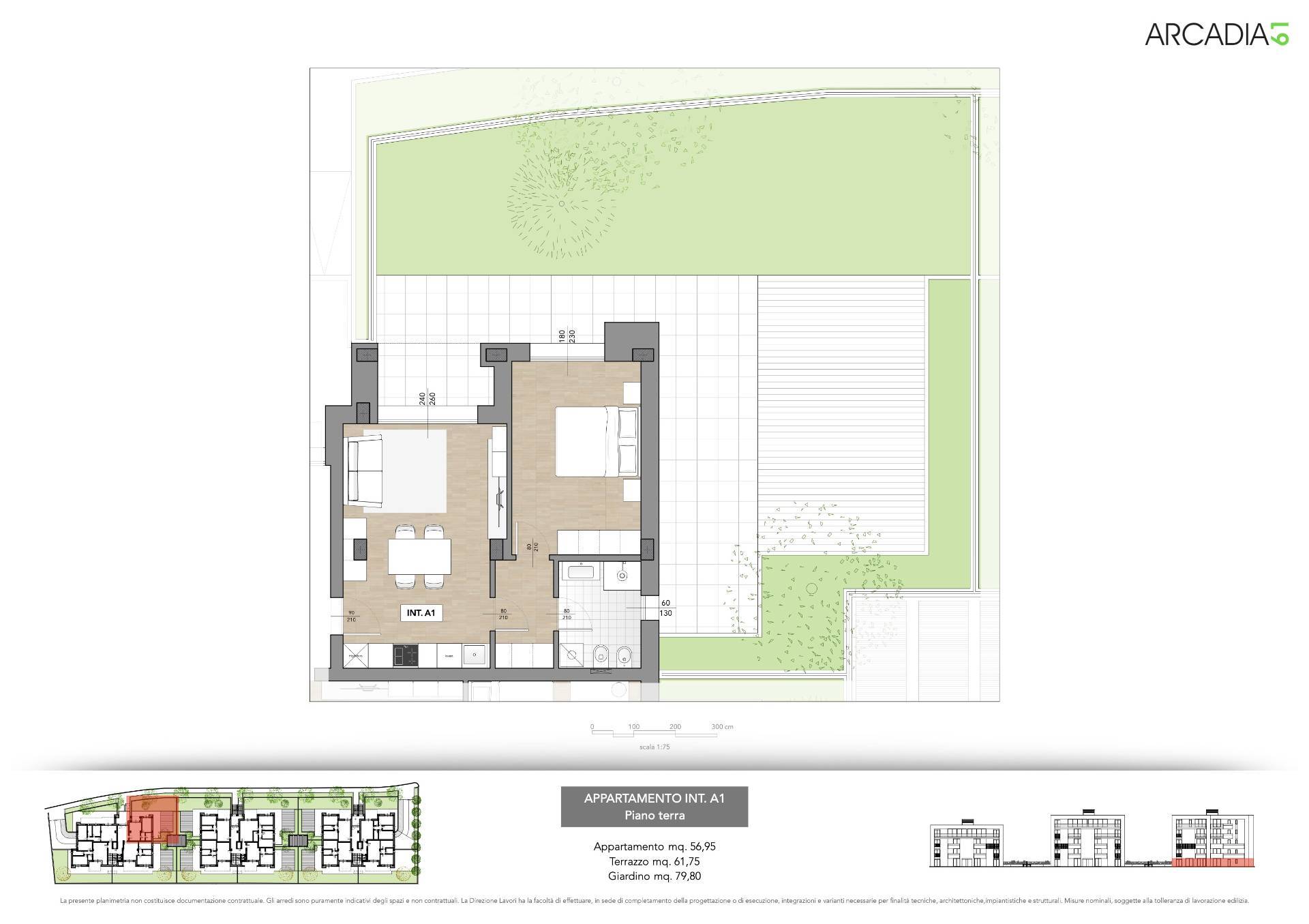 Appartamento al piano terreno, delle dimensioni di 57 m² circa, composto da ingresso su soggiorno con angolo cottura, una camera da letto matrimoniale, un bagno finestrato, corridoio nel reparto notte. L'Appartamento è inoltre fornito di una corte esterna pavimentata delle dimensioni di 62 mq circa, oltre ad un giardino privato di 60 m² circa allestito a verde e recintato. Completa la proprietà una fioriera privata di 20 mq.