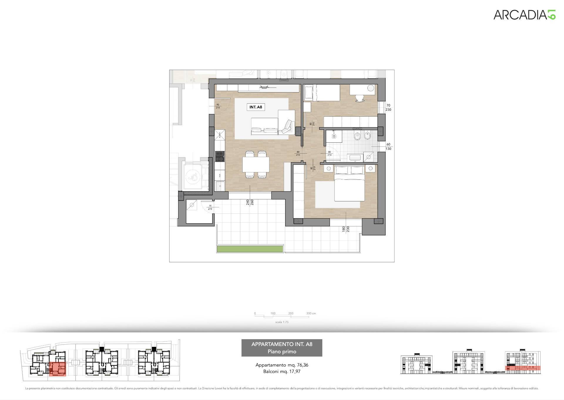 Appartamento al piano primo, delle dimensioni di 76 m² circa, composto da ingresso su soggiorno con angolo cottura, due camere da letto (una matrimoniale ed una comoda singola), un bagno finestrato, disimpegno nel reparto notte e comodo ripostiglio lavanderia in balconata. L'Appartamento è inoltre fornito di una terrazza abitabile di ben 18 mq circa, fruibile nella bella stagione per poterci soggiornare.