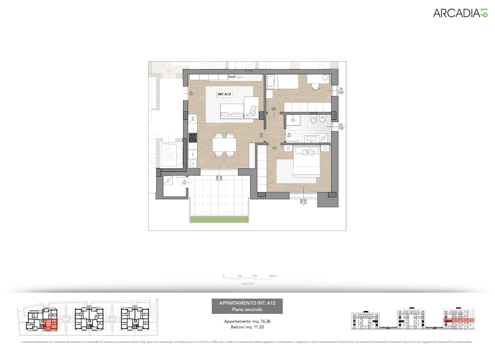 Appartamento al piano secondo con ascensore, delle dimensioni di 76 m² circa, composto da ingresso su soggiorno con angolo cottura, due camere da letto (una matrimoniale ed una comoda singola), un bagno finestrato, disimpegno nel reparto notte e comodo ripostiglio lavanderia in balconata. L'Appartamento è inoltre fornito di una terrazza abitabile di ben 12 mq circa, fruibile nella bella stagione per poterci soggiornare.