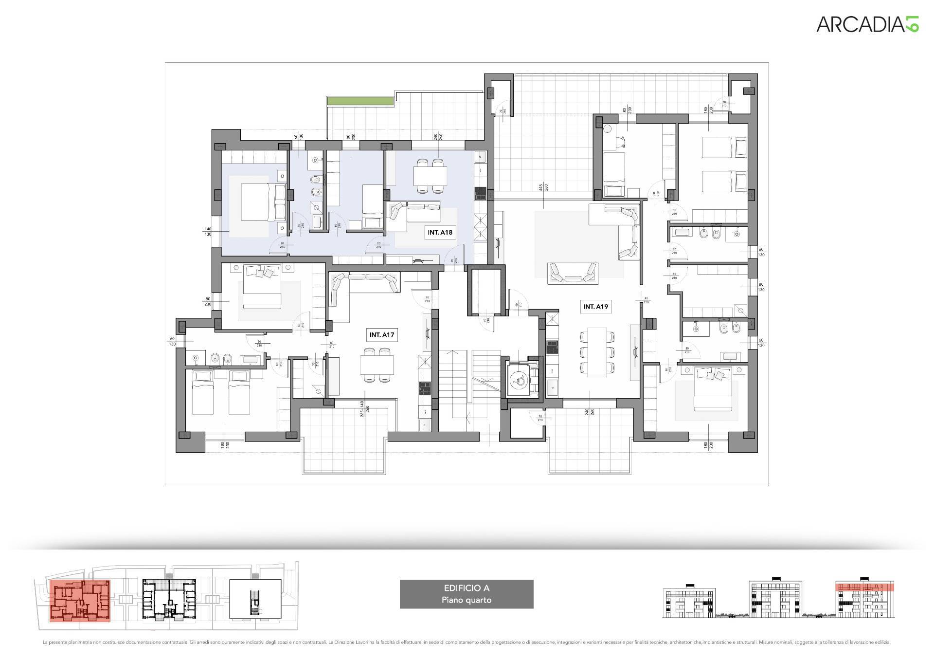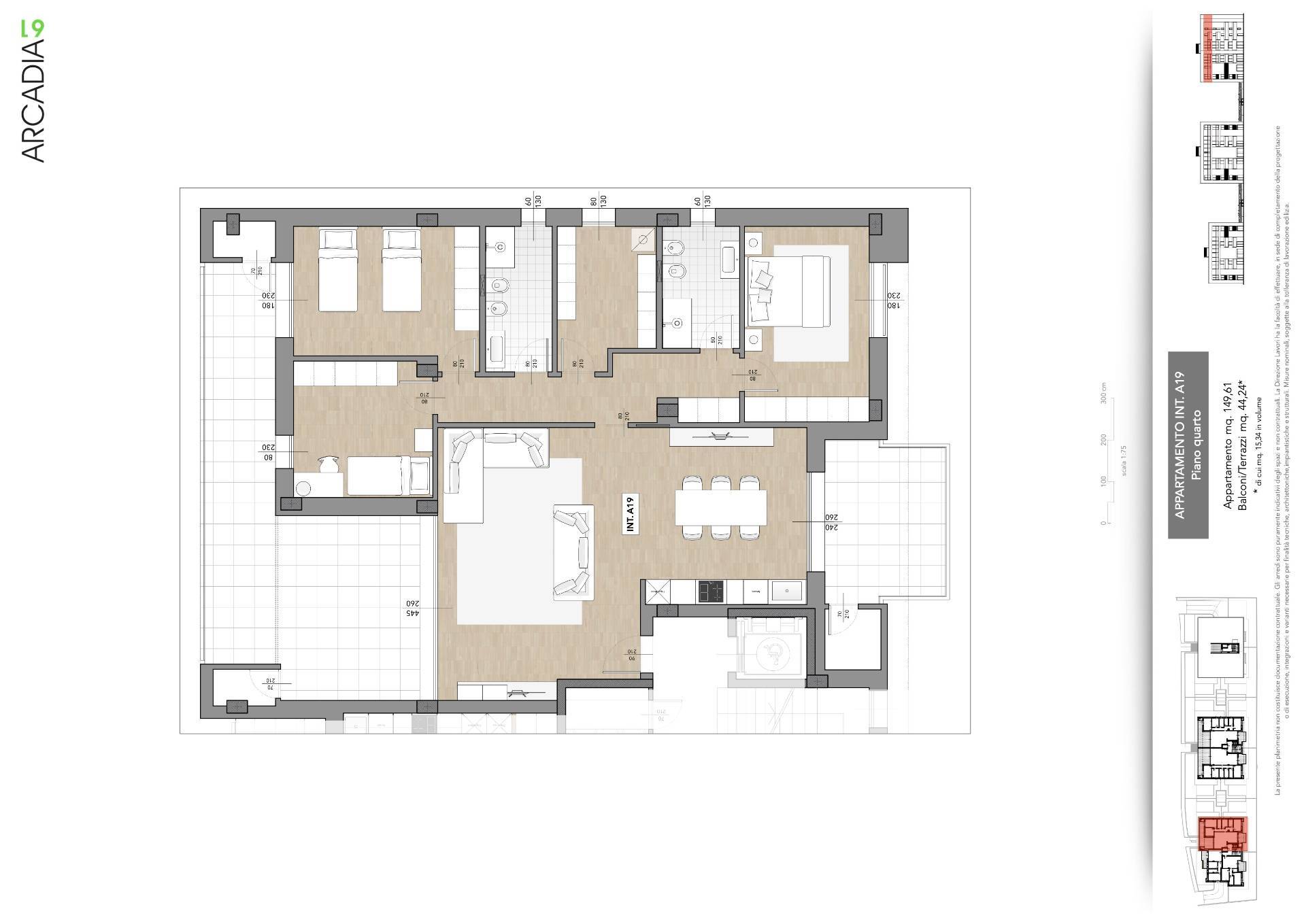 Attico al piano quarto con ascensore, delle dimensioni di 150 m² circa, composto da ingresso su soggiorno con parete in cristallo, ampia cucina abitabile, tre camere da letto (due matrimoniali ed una comoda singola), due bagni entrambi finestrati, cabina armadio (o studio) con lavanderia con finestra, corridoio nel reparto notte. L'Appartamento è inoltre fornito di due distinte terrazze per un totale di 44 mq circa, fruibile nella bella stagione per poterci soggiornare.
