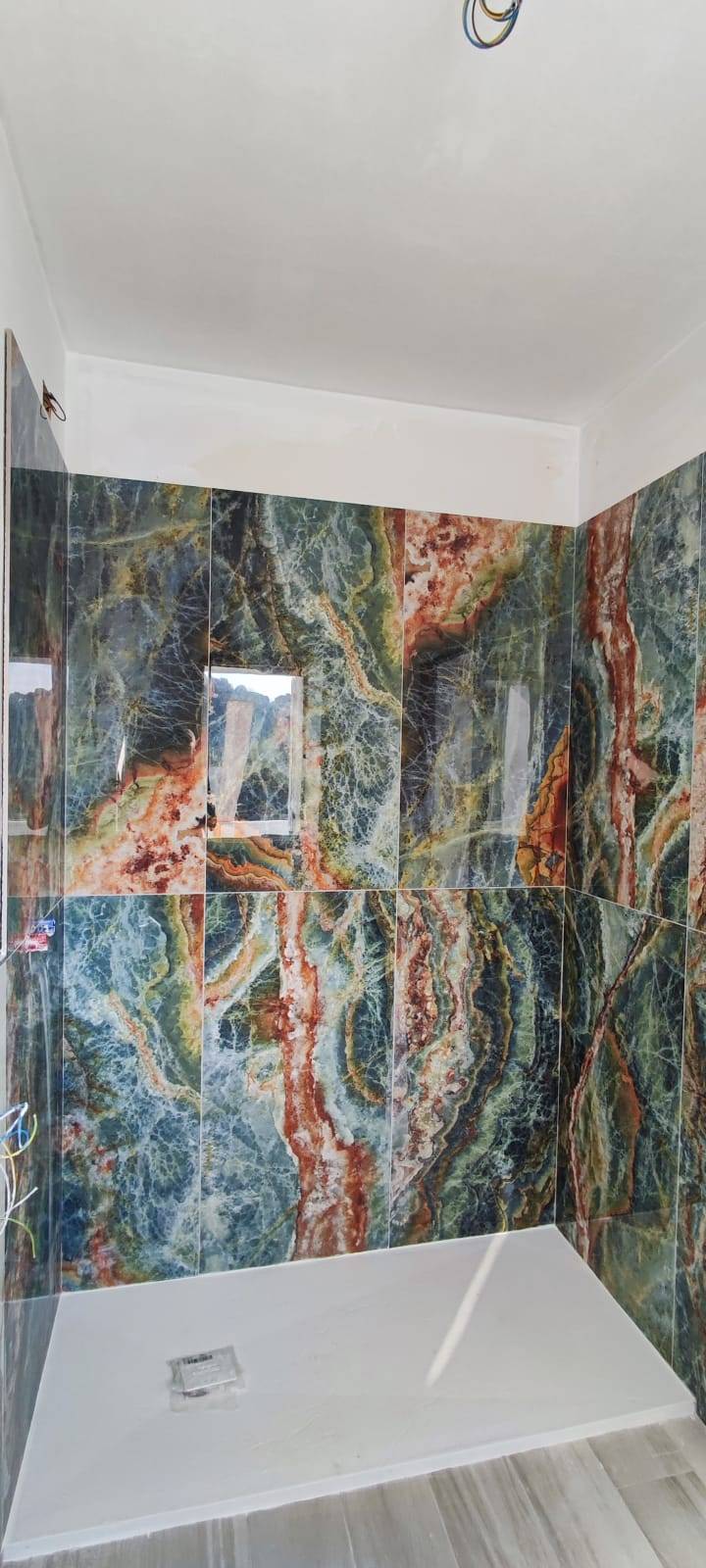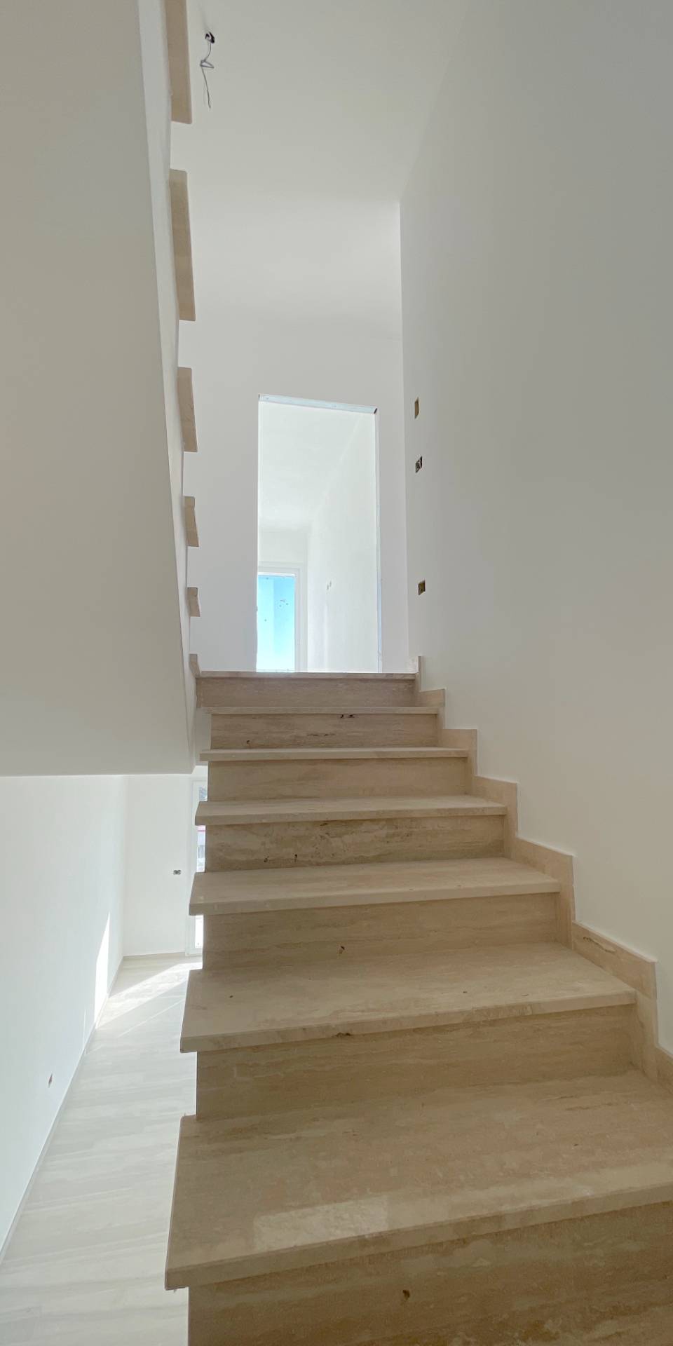 Il piano primo, collegato da una elegante scala interna in travertino, ospita tre camere da letto, di cui una matrimoniale con bagno en suite, due camere singole, un bagno principale e una terrazza panoramica con vista mare, oltre a balconi per una superficie complessiva di circa 55 m², veri e propri spazi da vivere all'aperto.