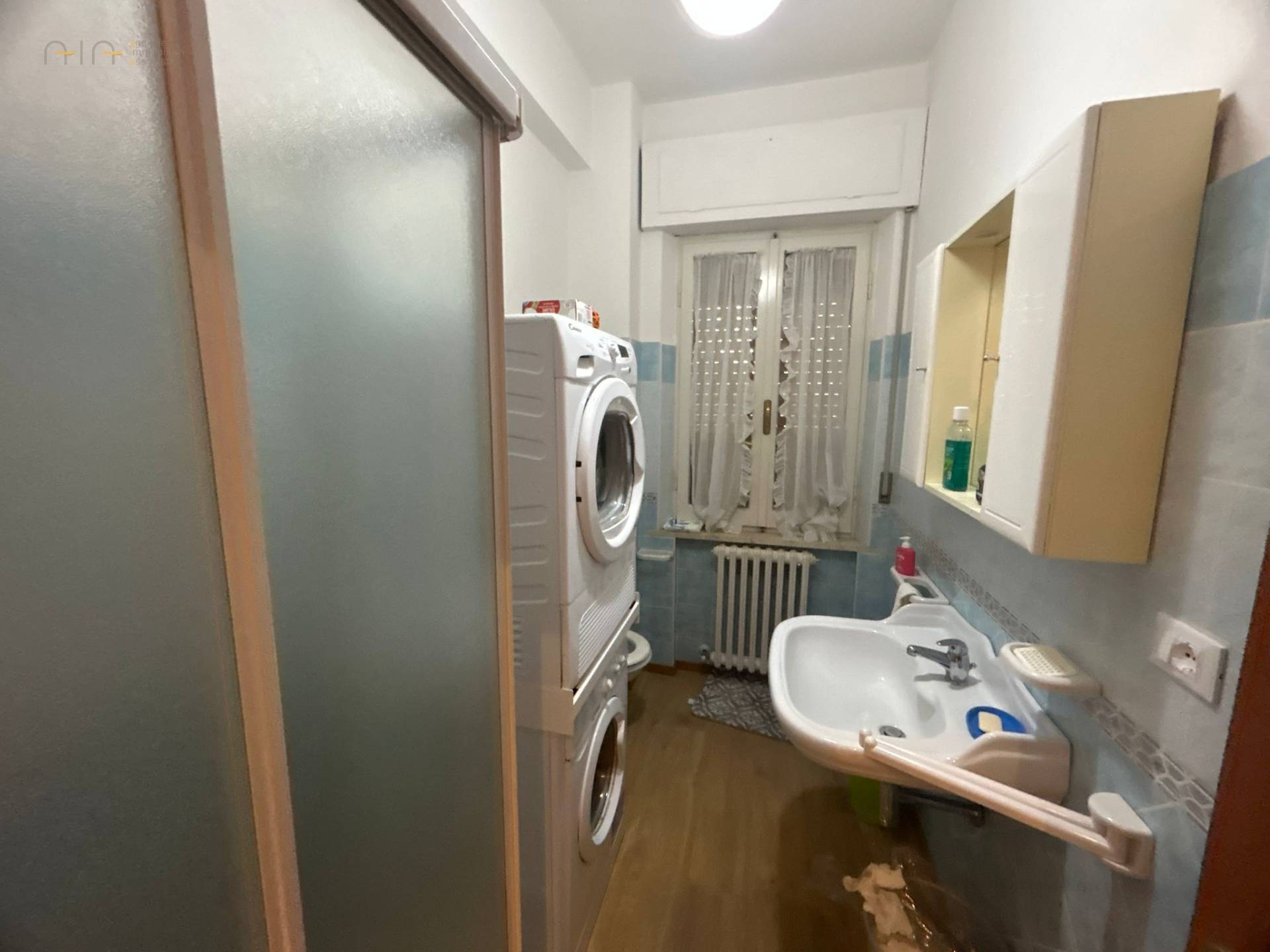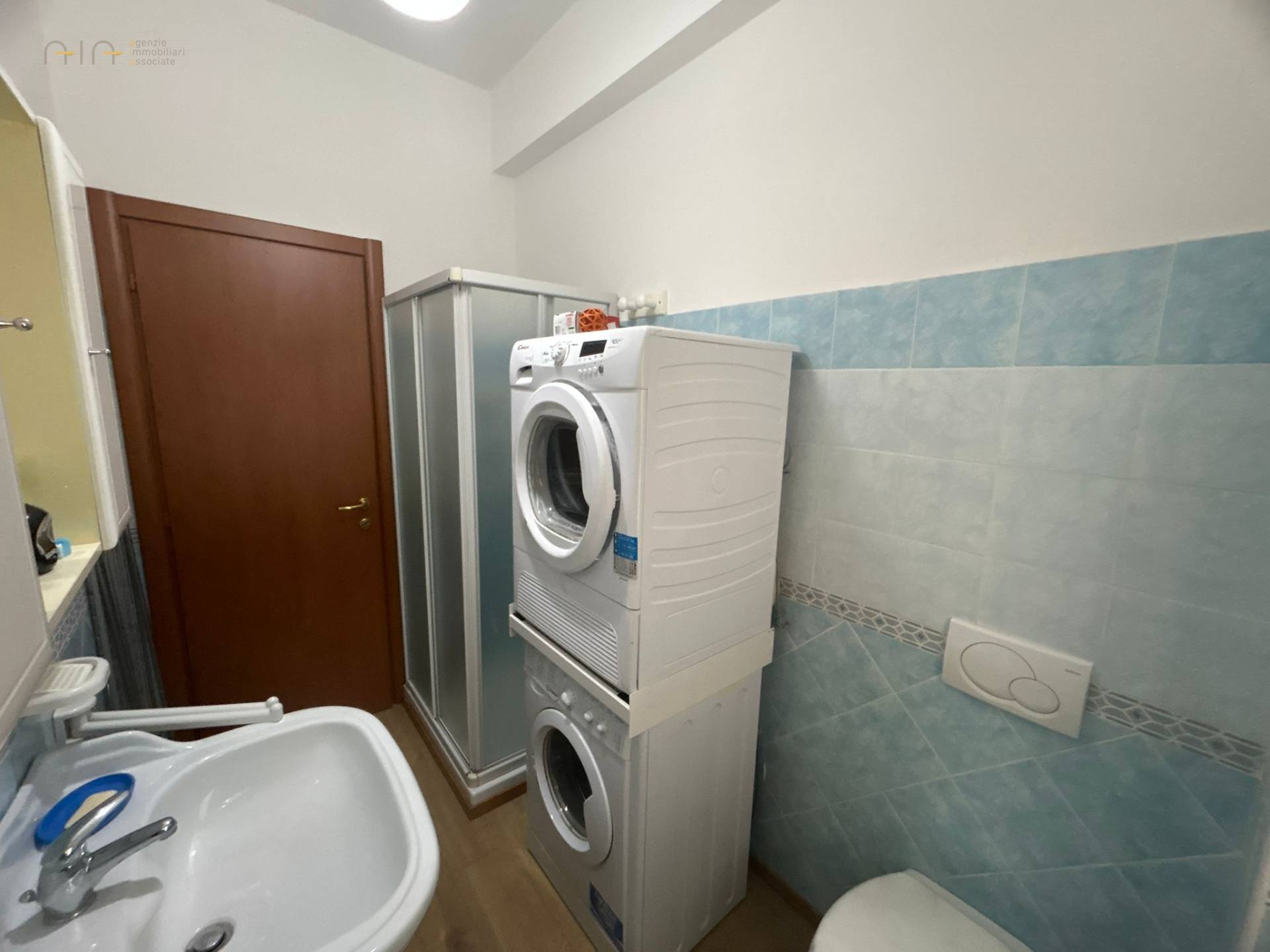 Bagno con doccia, dotato di lavatrice e asciugatrice